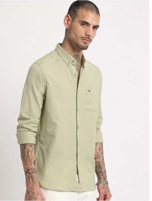 Green solid opaque casual shirt ,has a button-down collar, button placket, 1 patch pocket, long regular sleeves, curved hem