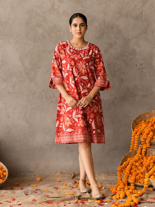 Celebrate the timeless elegance and charm with our blue block-printed short flared dress, adorned with exquisite hand-embroidered details on the neck. Meticulously crafted from 100% cotton, this dress offers a grace along with a comfortable experienceProduct Features- 100% Cotton block printed dress- Short A line fit dress- 3/4th Sleeves with cuff detail- Round neck with embroidery details - Side Pockets Size GuideModel height is 5feet 8 inches and is wearing size Small