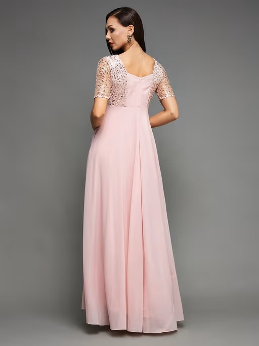 Dusty Pink Georgette Solid Embellished Maxi Dress. Has a square neck and half sleeves. Has gatheres and pleats. Has closure at the back.