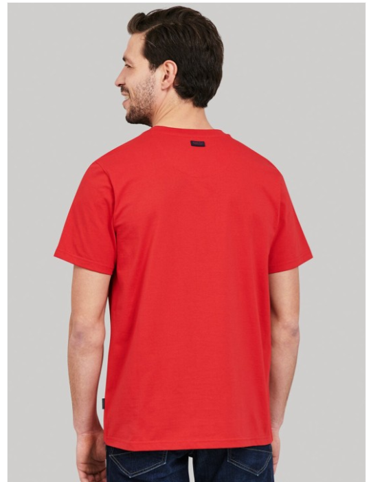 Red printed T-shirt, has a round neck, and short sleeves