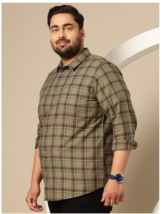 Olive green tartan checked opaque Casual shirt ,has a spread collar, button placket, 1 patch pocket, long regular sleeves, curved hem