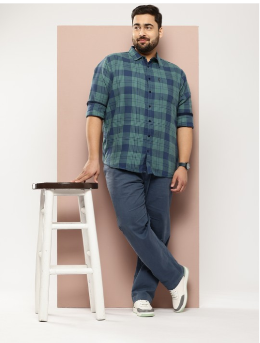 Blue checked opaque casual shirt, has a cutaway collar, button placket, 1 pocket, long regular sleeves, curved hem