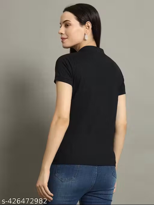 RISS Women Solid Half Sleeves Polo Neck T-shirt. Stay effortlessly stylish and cool this summer with our Women's Polo Neck T-Shirt. Crafted from lightweight and breathable fabric, this t-shirt is perfect for warm days and balmy evenings. The polo neck design adds a touch of sophistication while offering a comfortable fit that complements any casual or semi-formal outfit. Available in a range of vibrant colors and classic neutrals,, our Women's Polo Neck T-Shirt is your go-to choice for both comfortable style.
