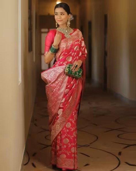 Banarasi Products are characterised by brocade borders & pallus. They often have woven butas or Jaal on the body. Luxurious weaves with an intense color scheme are their specialty, along with jewel-toned brocades, zari, quality silk, and lavish embroidery.This resplendent banarasi design is handpicked from skilled craftsmen and one of the finest in the country.