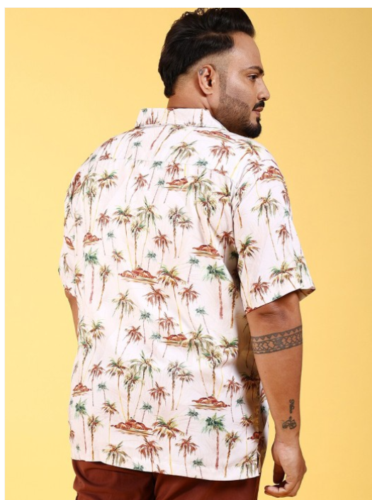 Beige & brown plus size conversational printed opaque Casual shirt ,has a cuban collar, button placket, short regular sleeves, curved hem