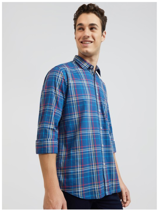 Blue tartan checks checked opaque Casual shirt ,has a spread collar, button placket, 1 patch pocket, long regular sleeves, curved hem
