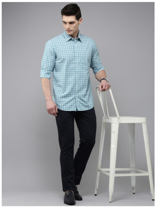 Blue & white checked opaque casual shirt, has a spread collar, button placket, 1 patch pocket, long regular sleeves, curved hem