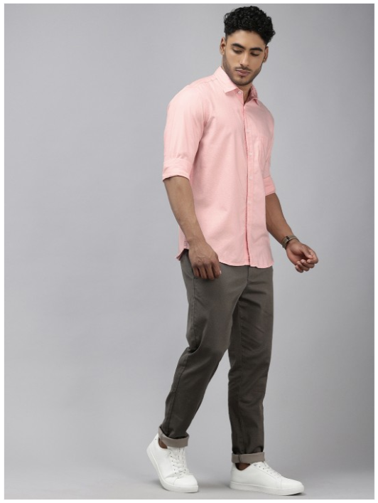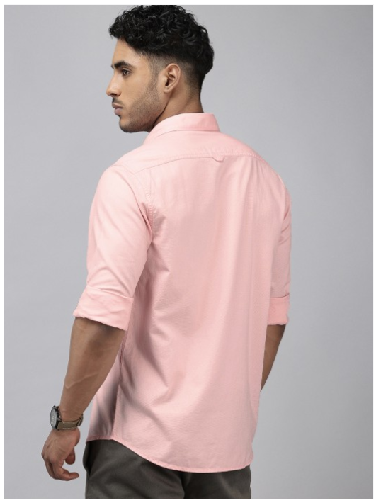 Pink textured self design opaque casual shirt, has a spread collar, button placket, 1 patch pocket, long regular sleeves, curved hem.