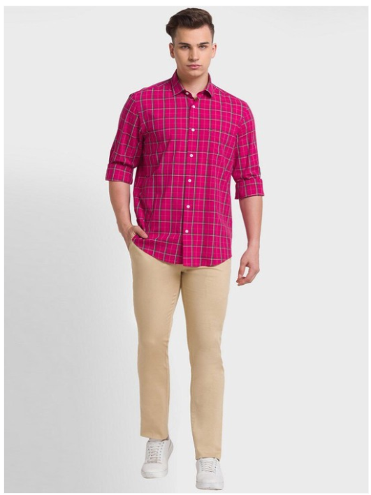 Pink tartan checks checked opaque Casual shirt ,has a spread collar, button placket, 1 patch pocket, long roll-up sleeves, curved hem