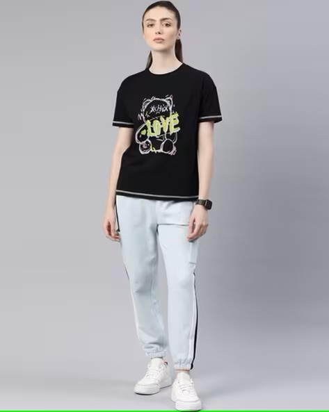 Women Typographic Print Regular Fit T-Shirt with Track Pants