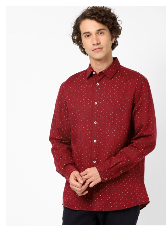 Maroon, blue and white printed casual shirt, has a cutaway collar, long sleeves, button placket, curved hem, and 1 patch pocket