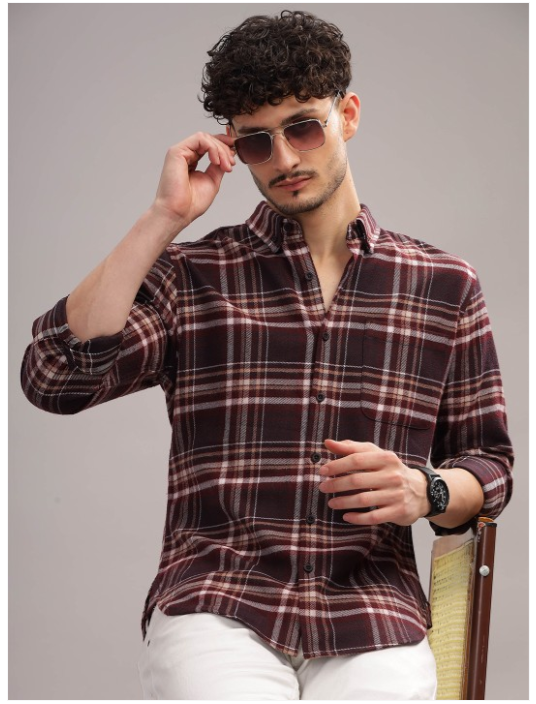 Brown tartan checks checked opaque Casual shirt ,has a spread collar, button placket, 1 pocket, long regular sleeves, curved hem